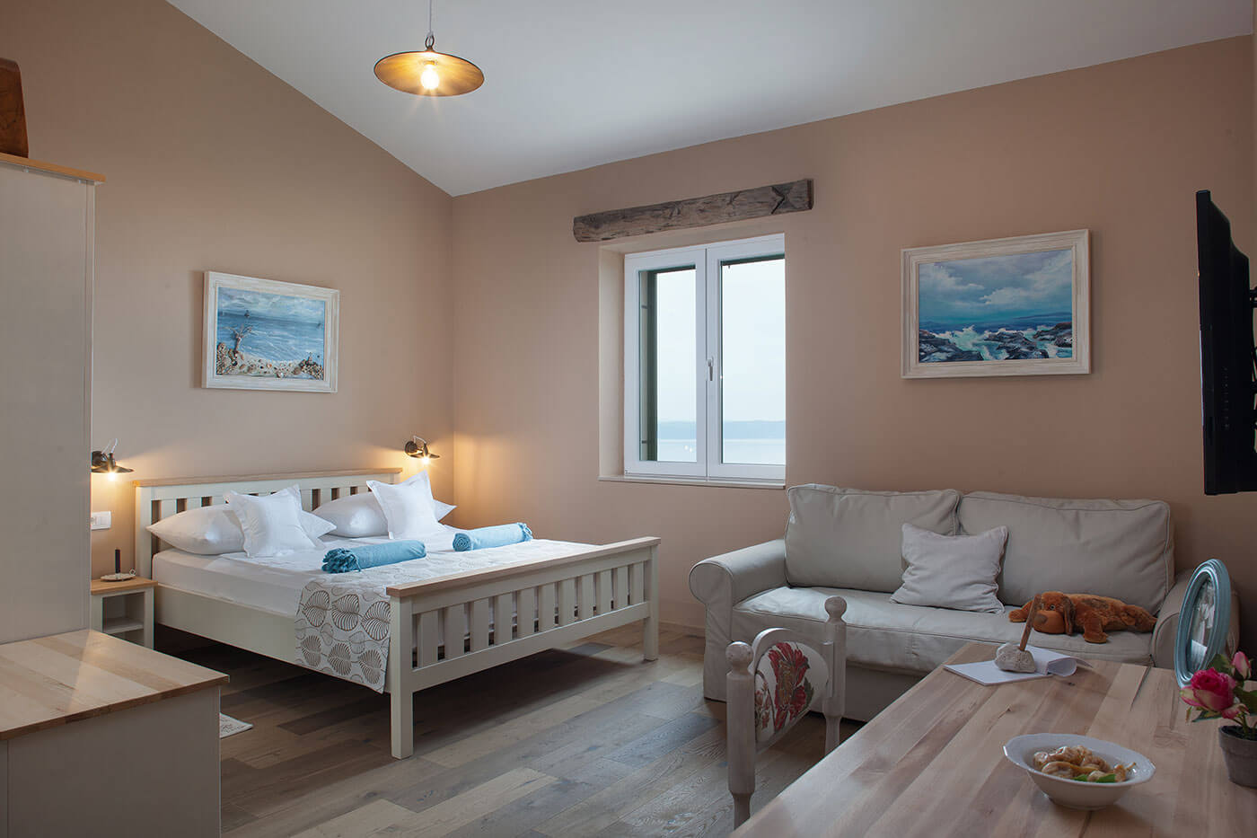 Villa Kate has two en-suite double bedrooms. Large and spacious living area is connected to the luxury equipped kitchen. Long glass wall divides the kitchen from the 200 square-meter terrace with the pool, sun beds, seating area, barbecue and additional toilet and shower.